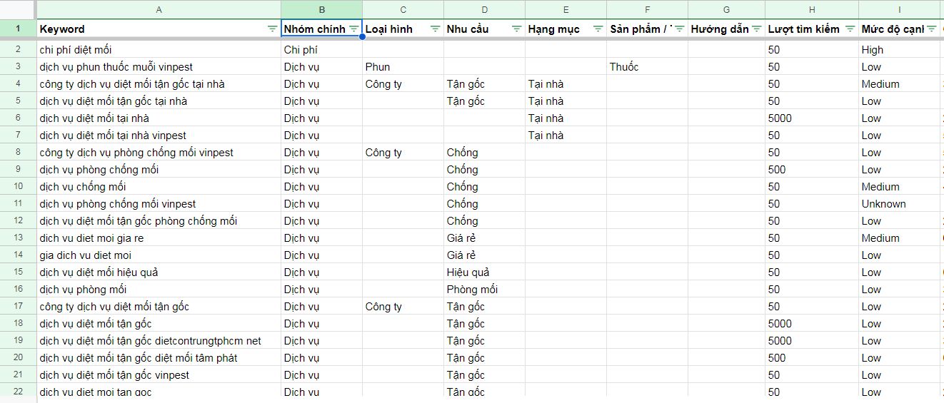 Danh sách hàng trăm từ khóa tìm kiếm thực tế trên Google về dịch vụ diệt mối.